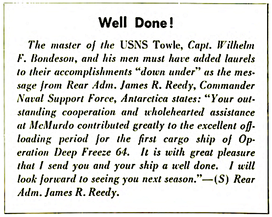 Captain Bondeson was scheduled to return the following year but was replaced aboard USNS Towle by another officer. The ship continued Antarctic supply support until the 1970s.