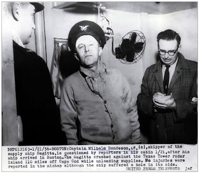 Bondeson was Captain of USNS Sagitta (TAK-87) during 1952-56. Another coastal cargo ship, Sagitta was used to service the "texas tower" early warning radar platforms located out on the Atlantic coast continental shelf. In 1956 he was reported as being something of a hero, saving his ship in heavy seas.