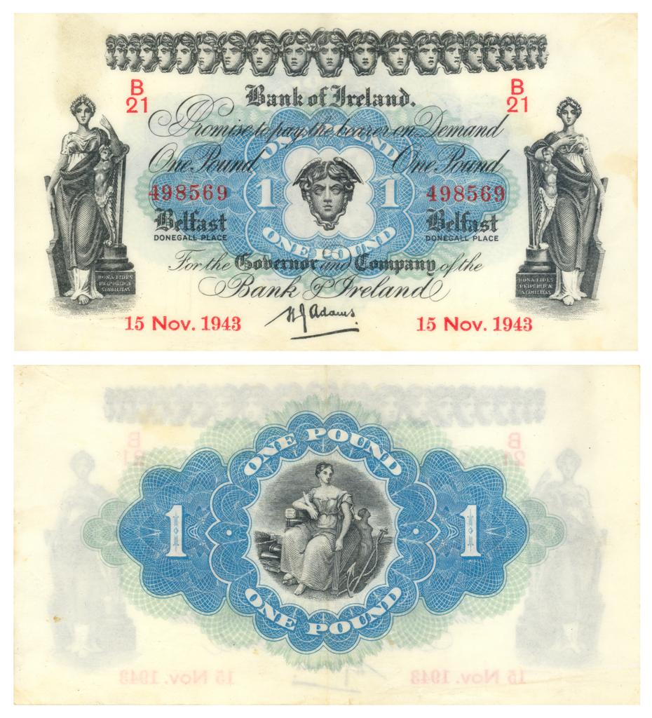 The Irish pound note has a picture of a slinky Roman-looking Hibernia (Ireland), with the inscription "Bona Fides Reipublica Stabilitas", which means something like "Good faith is the anchor of the Republic". This is probably not what Hibernia is actually saying. Hibernia looks a lot more interesting than the Queen, who seems something of a sourpuss. It's signed by WJ Adams, a good Irish name.