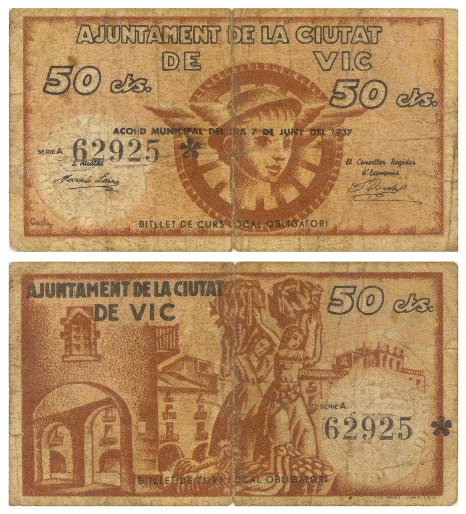 There was this little bar (heh..heh..in Spain there was a bar everywhere) near the entrance to the funicular railway (look it up, I had to) to the ski resort of Nuria (now called "Vall de Nuria"). I had some wine with this little old man, and he gave me this bill. Although he didn't speak much English, and my Spanish was limited to things I wanted from pretty girls, we somehow had a long conversation. During the Spanish Civil War, every municipality had to make it's own money, and this bill was from a small town in the Barcelona area. My new friend had fought in the Civil War, and he gave me this as a memento. I think I gave him an American dollar bill in return, all I had that was